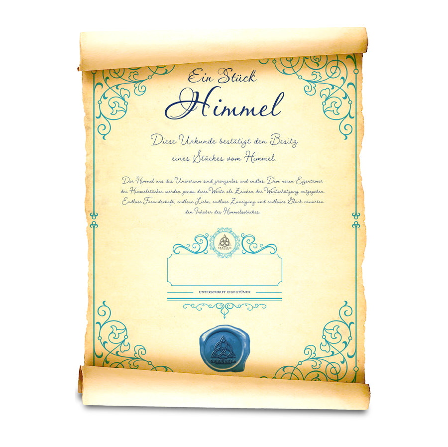 Wenn du auf der Suche nach einem ganz besonderen Geschenk für deine Liebste oder deinen Liebten bist, dann haben wir von Okkultia genau das richtige für dich. Schenke doch ein Stück vom Himmel. Einen außergewöhnlicheren Liebesbeweis wirst du kaum finden. Der Beschenkte erhält von uns eine Urkunde, die unterzeichnet werden muss, eine passende Kalligrafie-Feder für die Unterschrift und natürlich auch ein Stück vom Himmel. Grundstücke am Mond oder auf dem Mars sind von gestern, bring deinen Liebsten den Himmel ein Stück näher mit Okkultia.