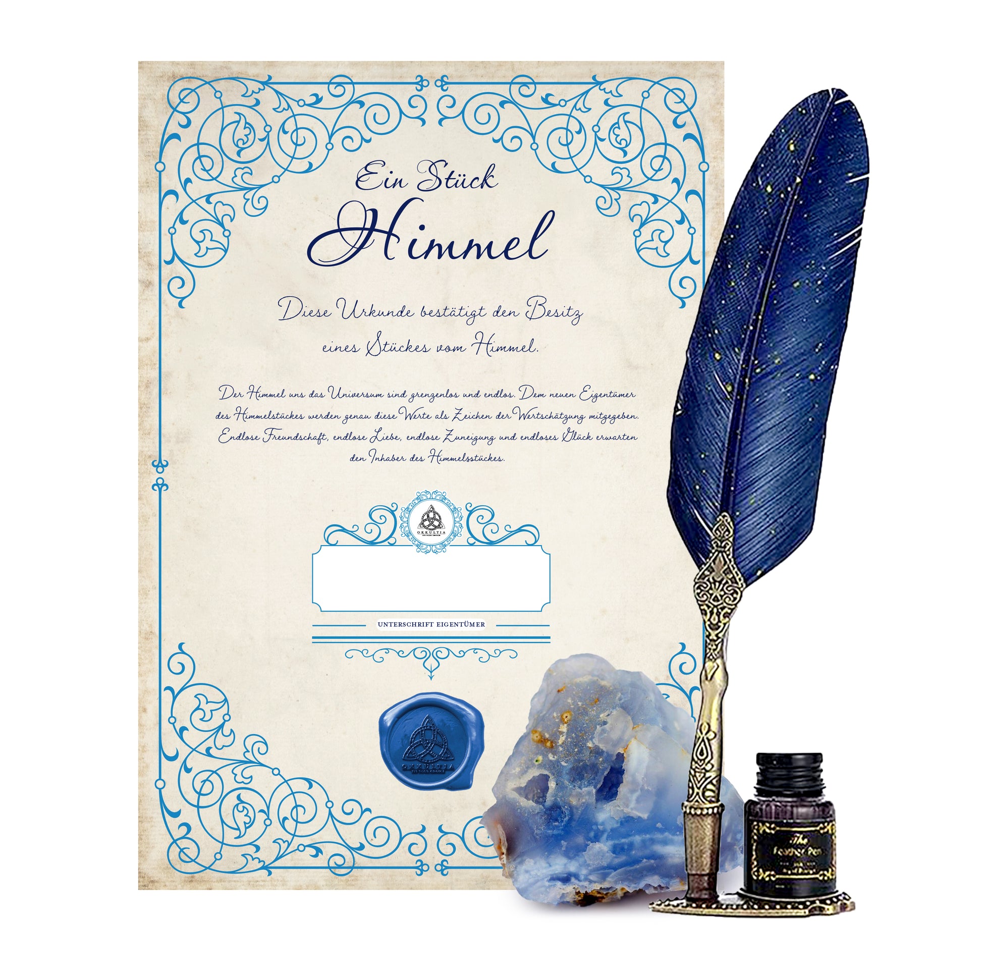 - ❤️ Bestehend aus einem Vertrag, einem Stück vom Himmel und eine Feder vom Himmel zum Signieren.